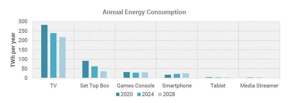 In 2024, the top devices for consuming video included TVs, set-top-boxes, gaming consoles, smartphones, tablets, and media streamers, and together they consumed more than 357 Terawatt hours (TWh) of energy – more than the annual electricity consumed by the countries of Australia and Norway combined. Though eye-opening, these numbers represent a 17 percent decrease in energy consumption since 2020. In fact, as older devices are replaced by more energy-efficient alternatives, the overall energy consumed by 2028 may decrease by another 12 percent.